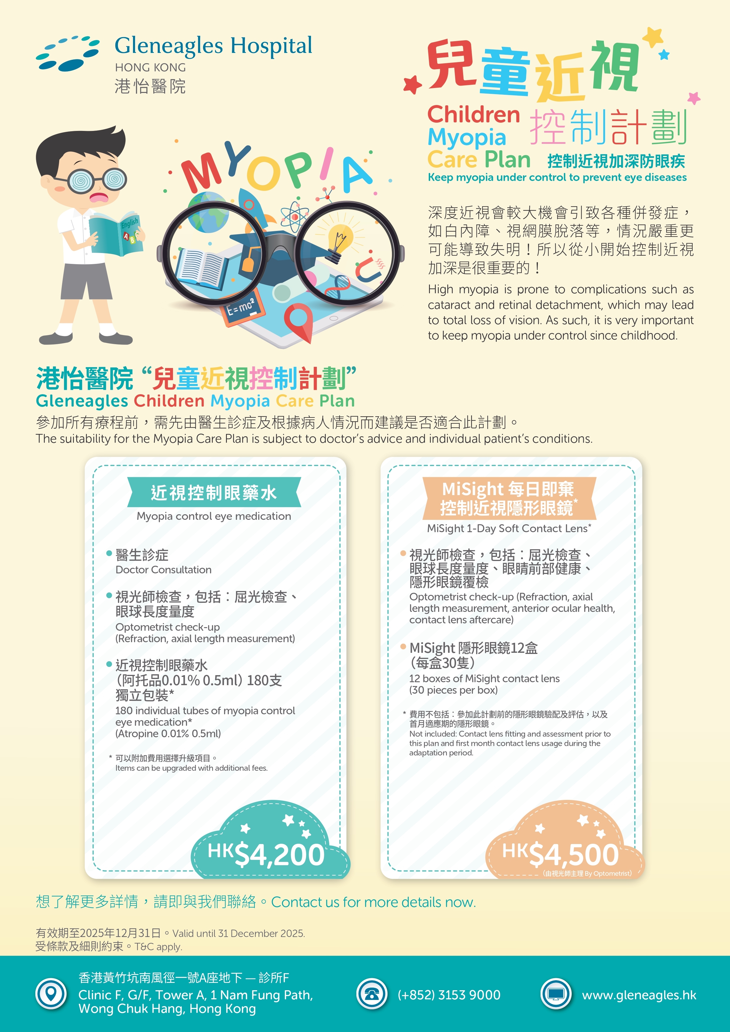 The special package includes one-time doctor consultation fee, specific injectable anti-VEGF medicine, and hospital procedure charge. For enquiries / appointment, please contact our Eye Clinic at +852 3153 9000.