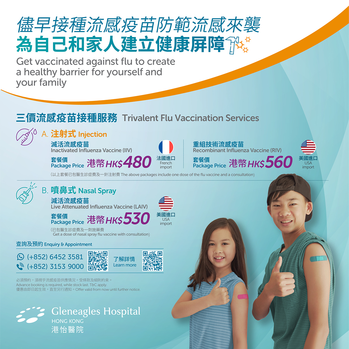 1.2 Injected Recombinant Influenza Vaccine (RIV) - HK$560 (inclusive of doctor’s consultation and one dose of vaccination);