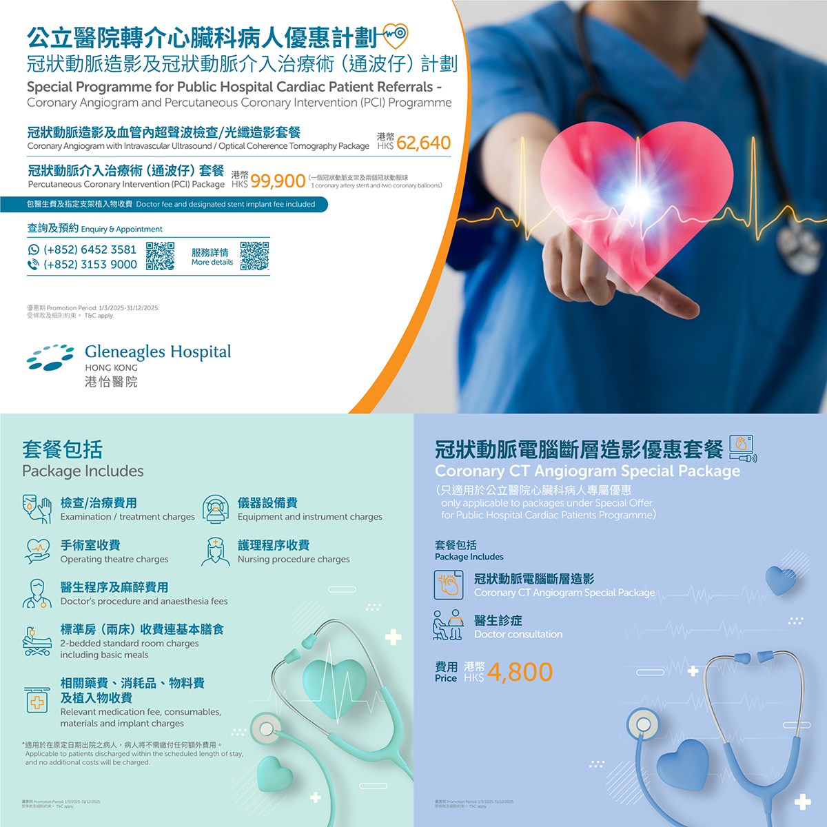 - If patient does not have a valid result of Coronary CT Angiogram, he/she is required to join the “Coronary CT Angiogram Special Package” offered by Gleneagles Hospital Hong Kong to decide on patient’s suitability of joining Gleneagles’ “Special Offer for Public Hospital Cardiac Patients – Coronary Angiogram and Percutaneous Coronary Intervention (PCI) Programme”. For details, please refer to the relevant poster or contact us at (+852) 3153 9000.