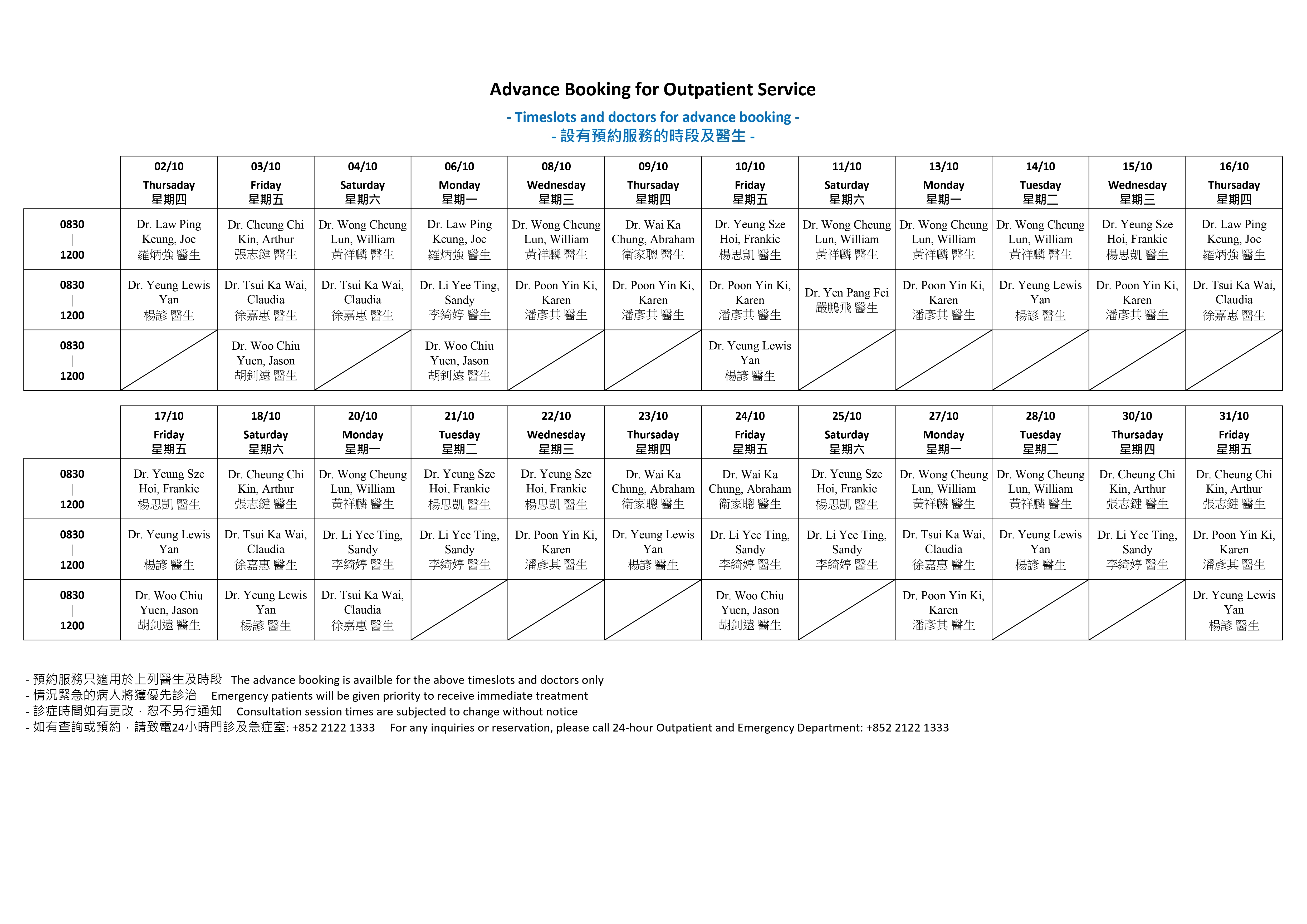 - 星期六中午十二時後,星期日,以及公眾假期不設預約服務